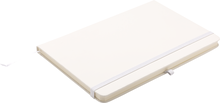 Zápisník A5 v bílých deskách z PU materiálu má 80 linkovaných listů. Blok má uzavírací gumičku, poutko na propisku a textilní záložku v barvě desek.