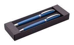 Dárková sada s modrou propiskou a rollerem v černé papírové krabičce.