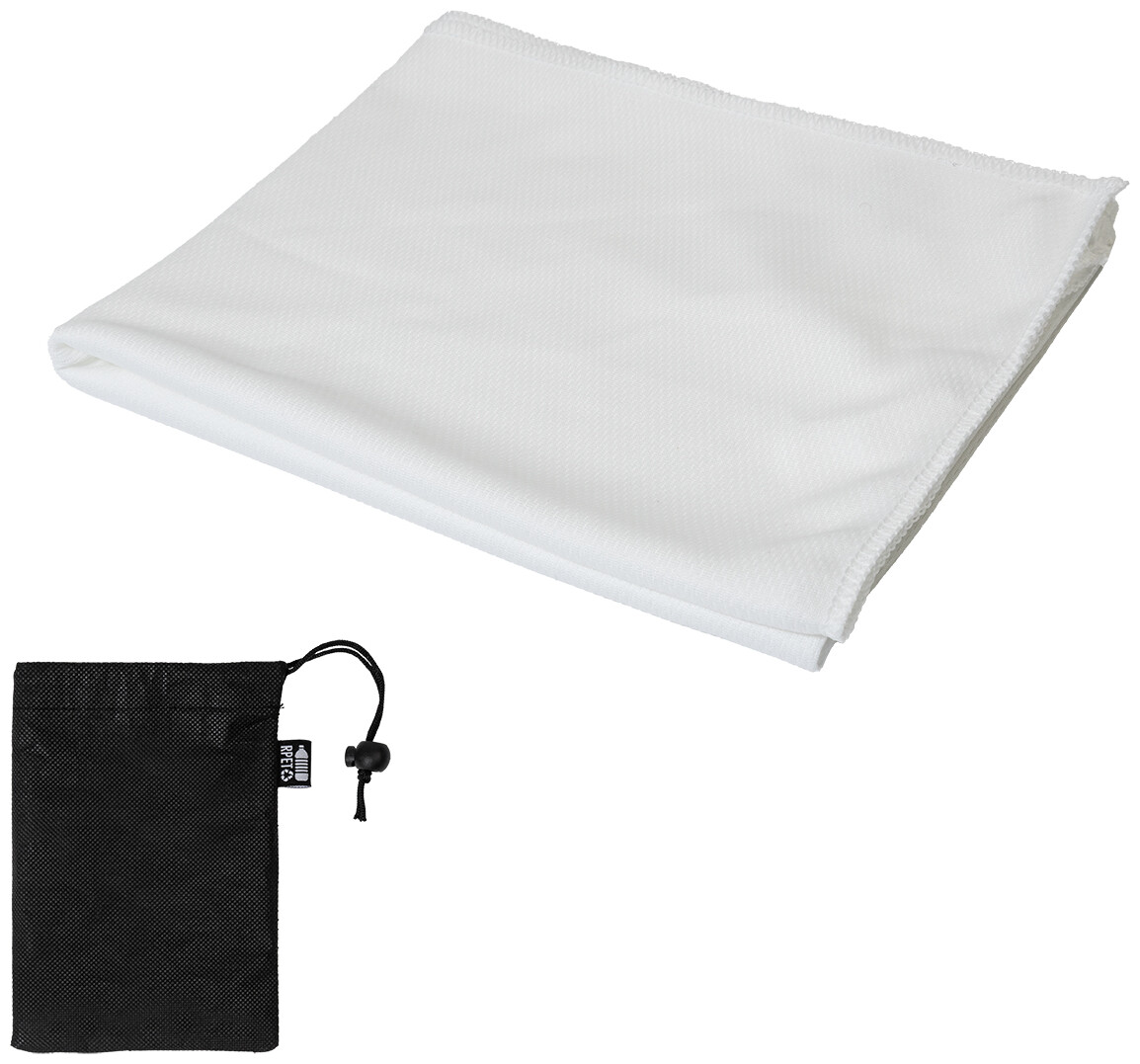 Sportovní ručník z mikrovlákna RPET v přepravním pouzdře z netkané tkaniny RPET s charakteristickou etiketou RPET. Polyester RPET, 140 g/m2.