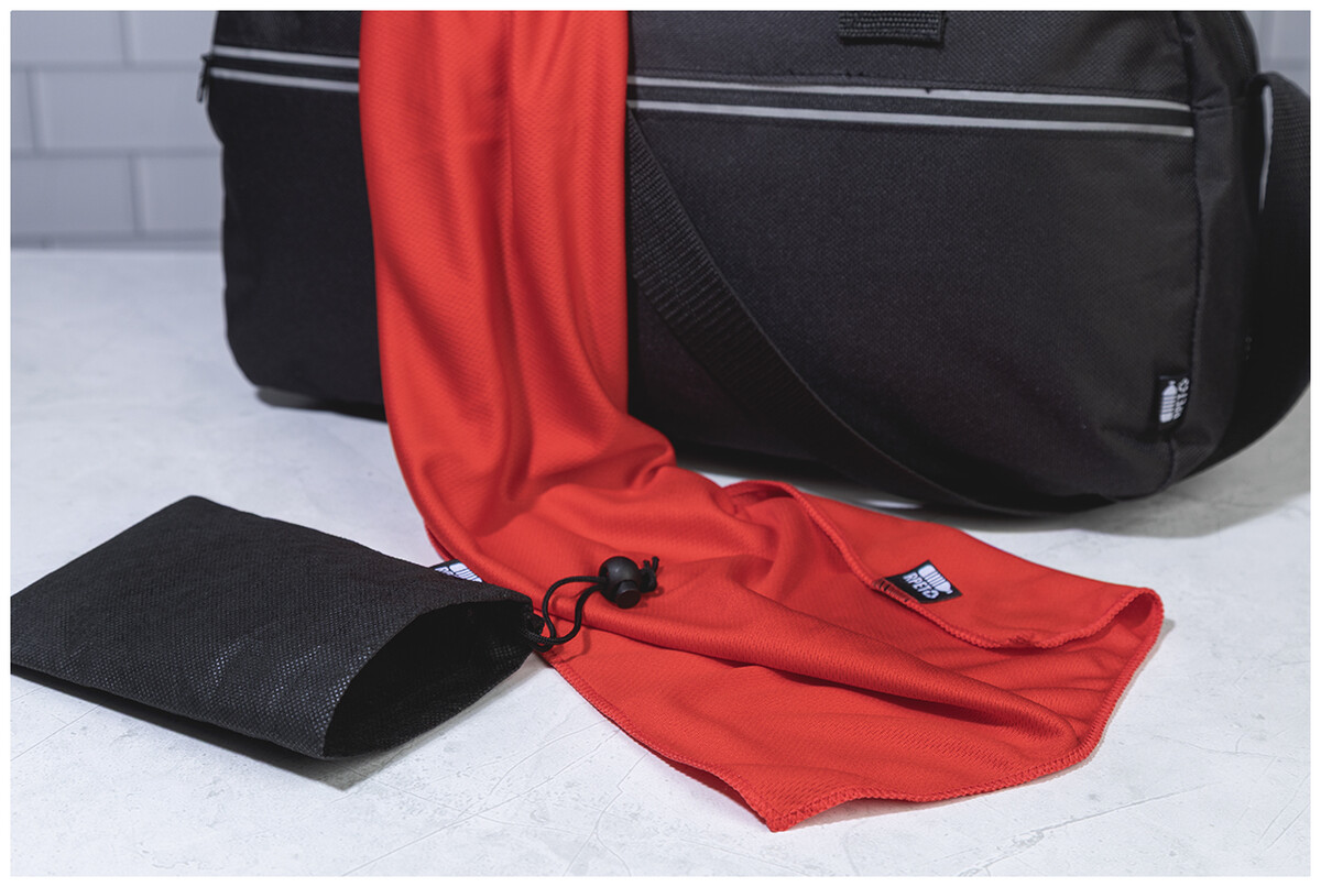 Sportovní ručník z mikrovlákna RPET v přepravním pouzdře z netkané tkaniny RPET s charakteristickou etiketou RPET. Polyester RPET, 140 g/m2.