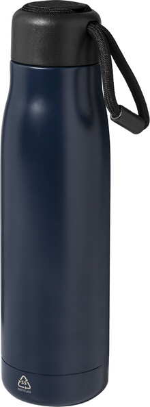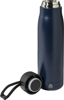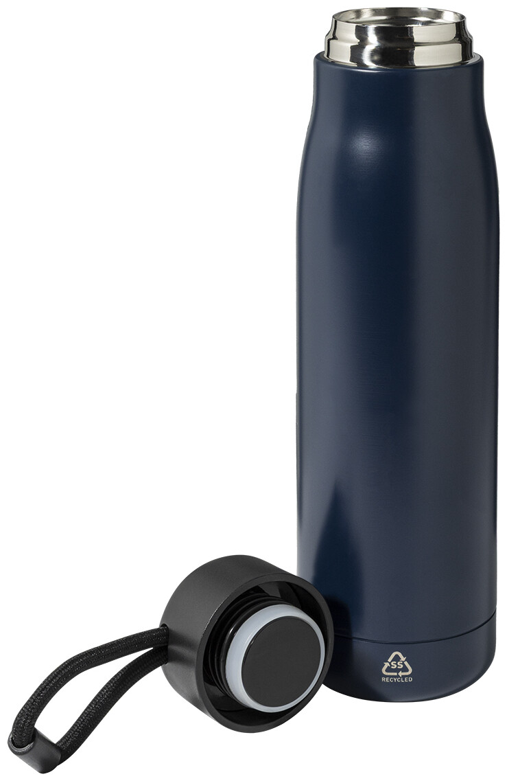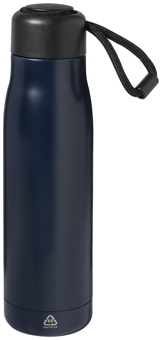 Dvoustěnná, vakuově izolovaná láhev z recyklované nerezové oceli s PP víčkem a integrovaným poutkem na nošení se šňůrkou. 500 ml.