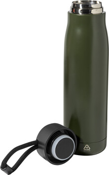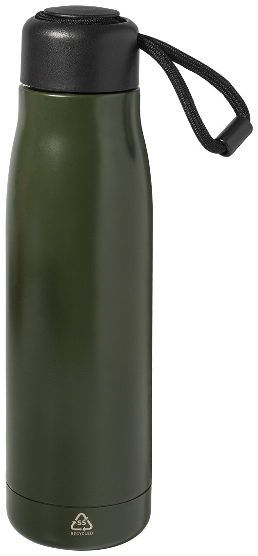 Dvoustěnná, vakuově izolovaná láhev z recyklované nerezové oceli s PP víčkem a integrovaným poutkem na nošení se šňůrkou. 500 ml.