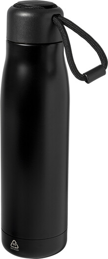 Dvoustěnná, vakuově izolovaná láhev z recyklované nerezové oceli s PP víčkem a integrovaným poutkem na nošení se šňůrkou. 500 ml.