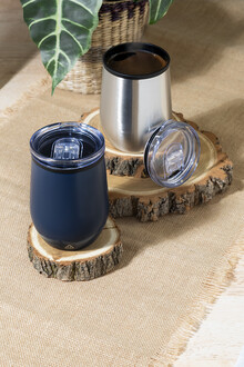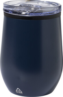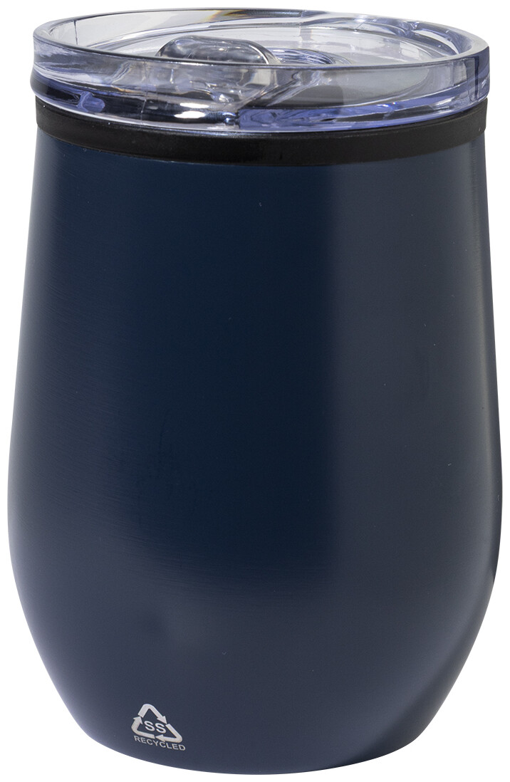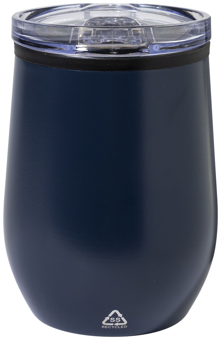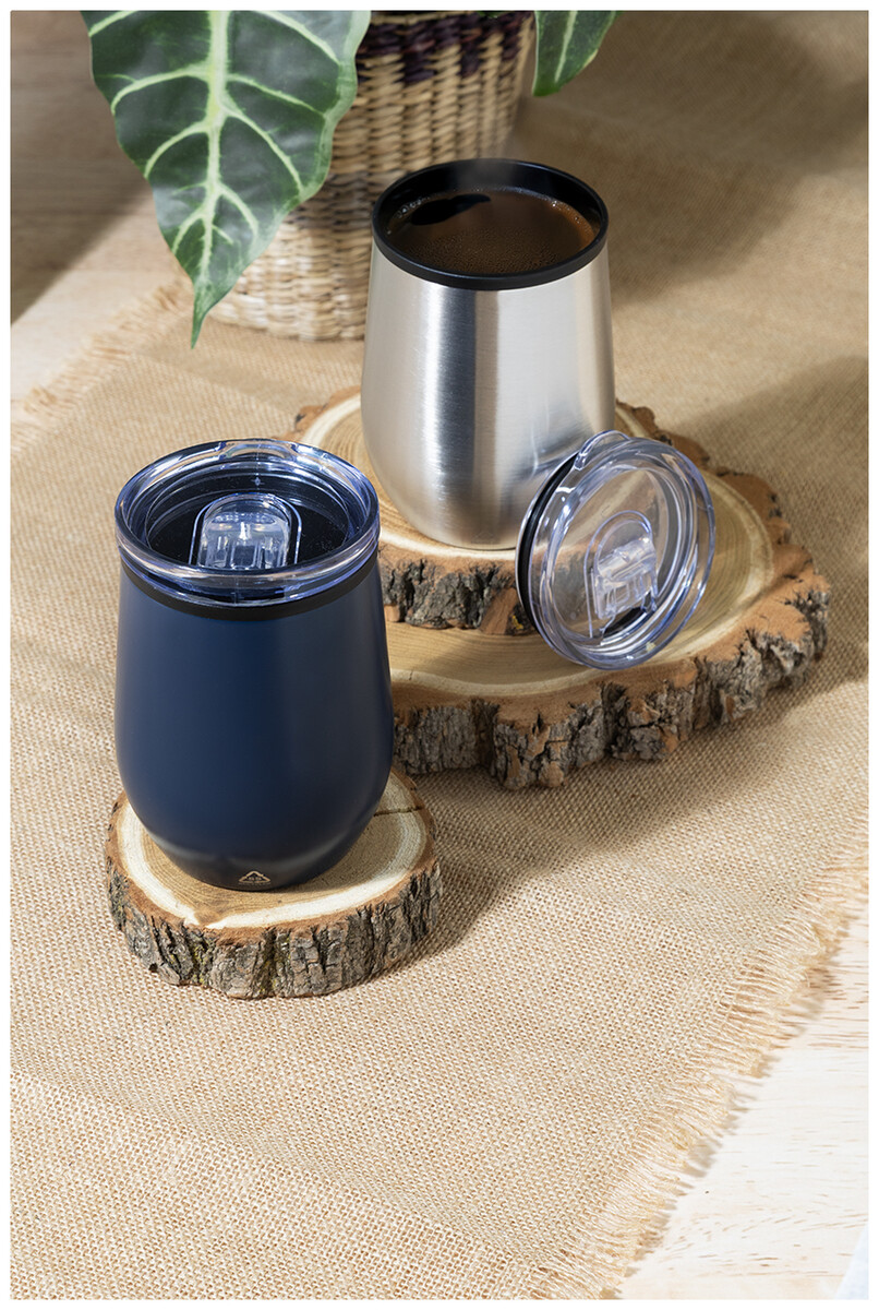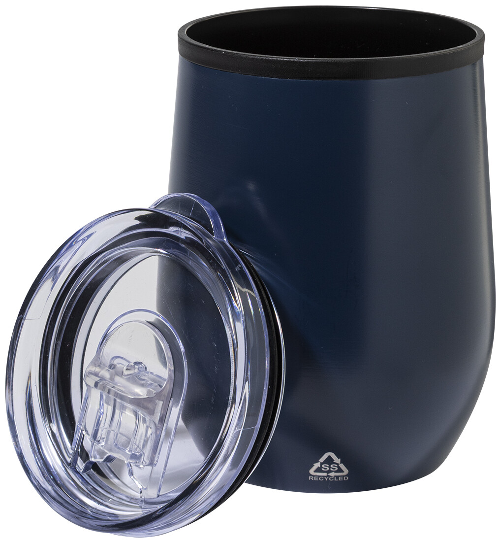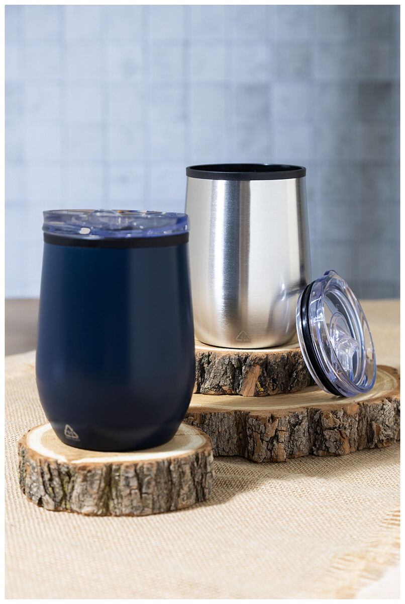 Dvoustěnný termo hrnek z recyklované nerezové oceli s vnitřní stranou z PP a víčkem z PS. 350 ml.