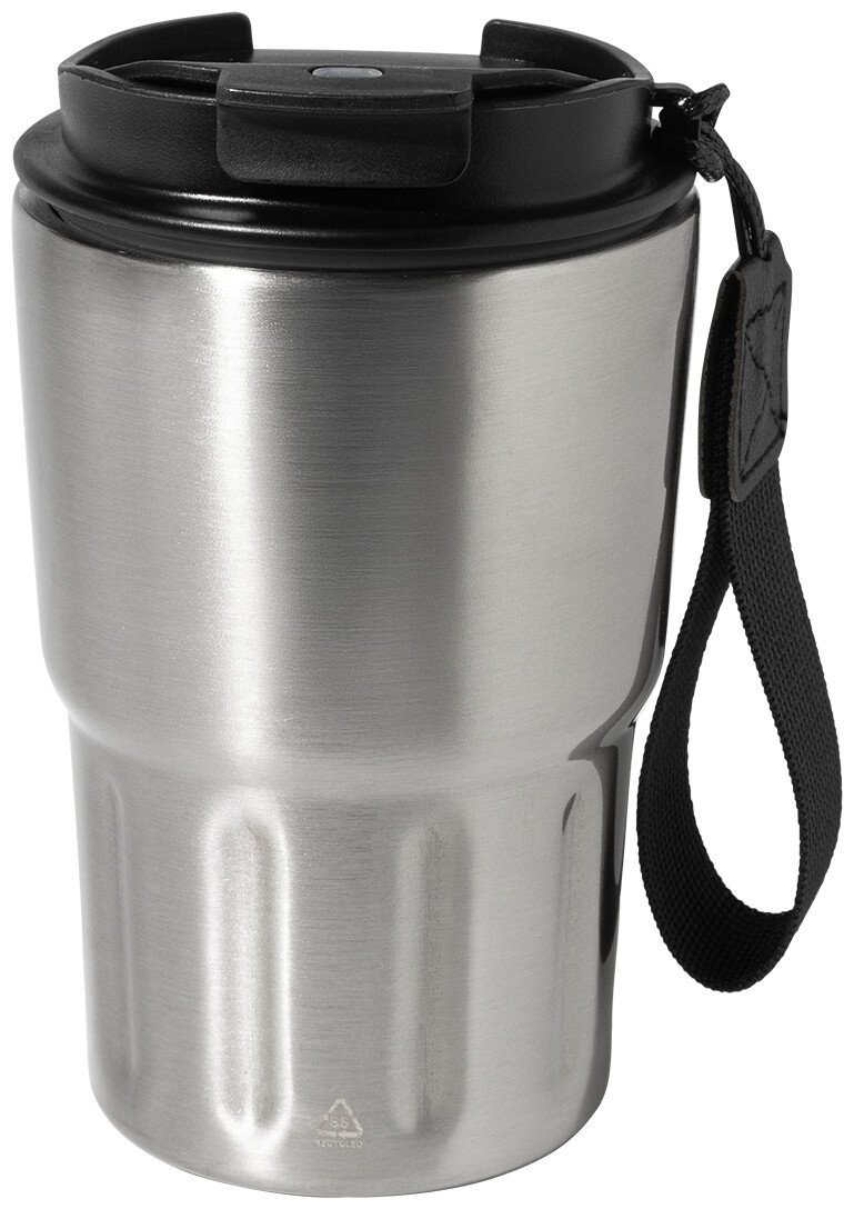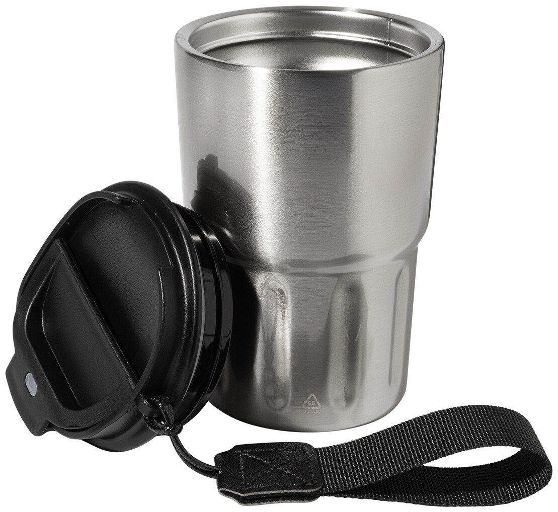 Dvoustěnný termo hrnek z recyklované nerezové oceli s izolačním víčkem z PP. S poutkem z RPET polyesteru. 350 ml.