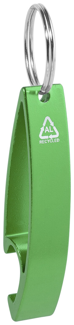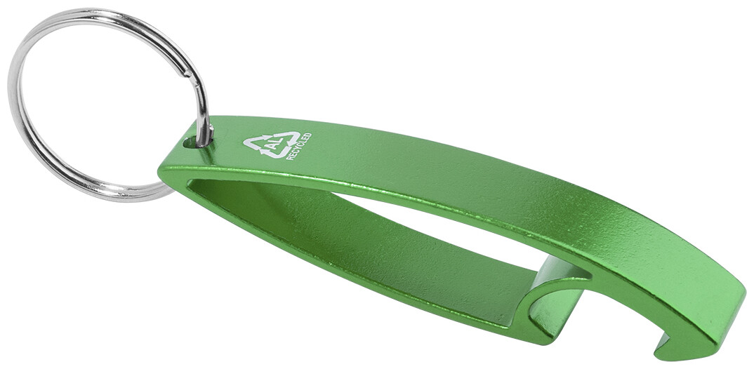 Otvírák na lahve z recyklovaného hliníku s kovovým kroužkem na klíče.