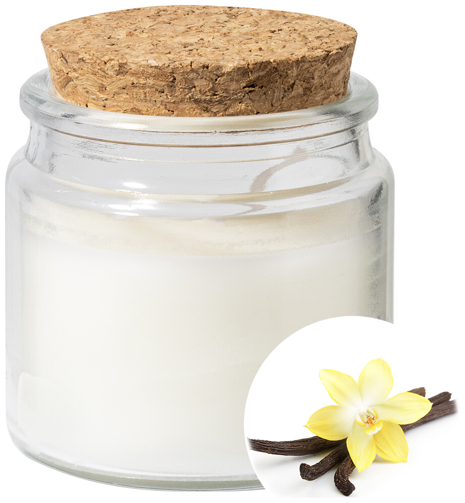 Vosková svíčka z rostlinného vosku s vůní vanilky ve skleněném svícnu s víčkem z přírodního korku. S 80 gramy vosku. Doba hoření: 16 hodin. V krabičce z kraftového papíru.