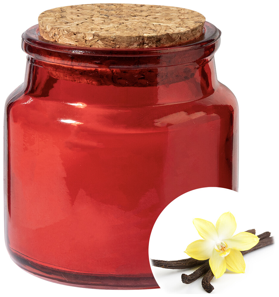 Vosková svíčka z rostlinného vosku s vůní vanilky ve skleněném svícnu s víčkem z přírodního korku. S 80 gramy vosku. Doba hoření: 16 hodin. V krabičce z kraftového papíru.
