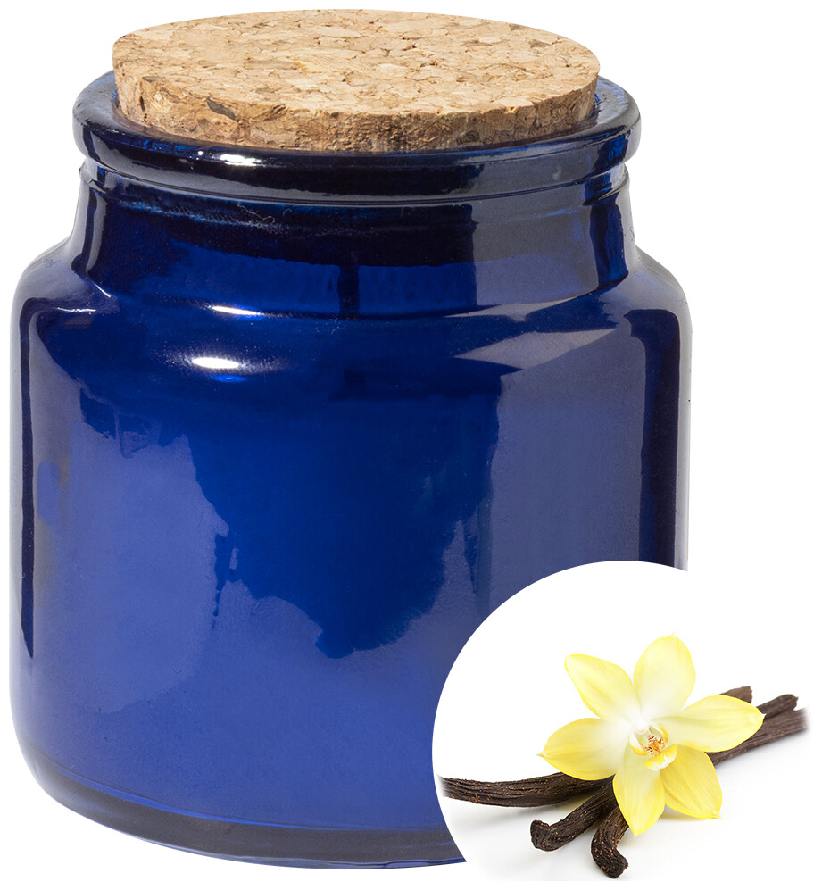 Vosková svíčka z rostlinného vosku s vůní vanilky ve skleněném svícnu s víčkem z přírodního korku. S 80 gramy vosku. Doba hoření: 16 hodin. V krabičce z kraftového papíru.