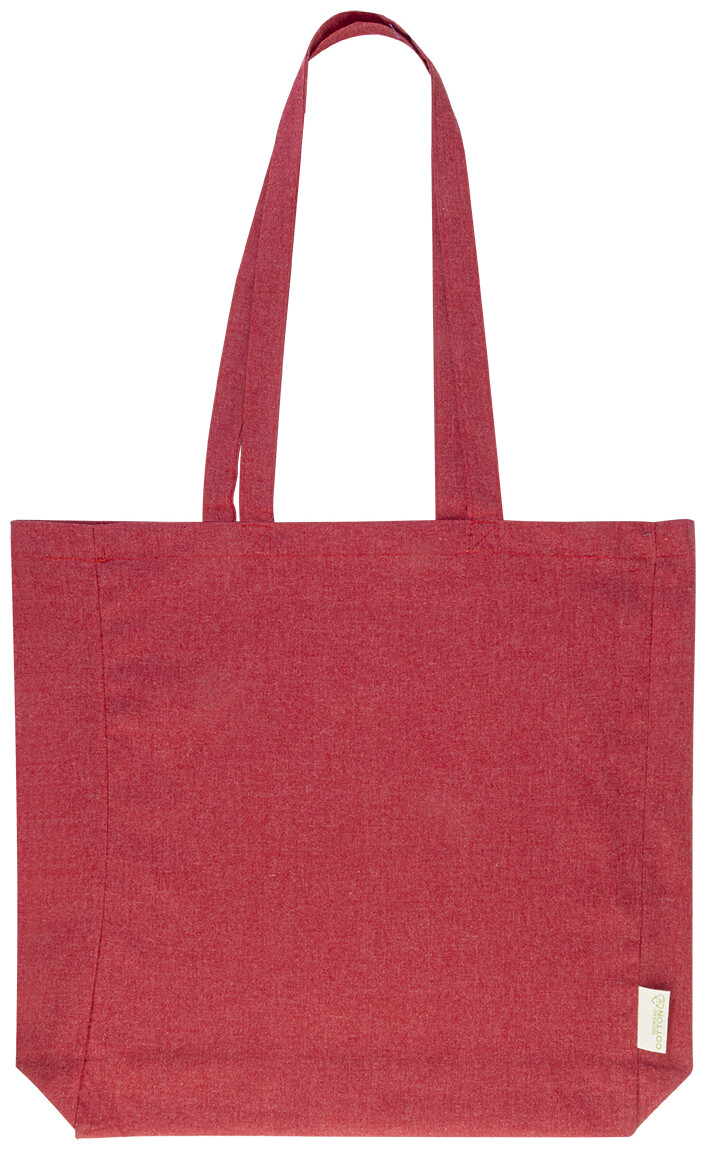 Nákupní taška s klínkem a dlouhými uchy ze 70 % recyklované bavlny a 30 % RPET polyesteru, 140 g/m2. S výraznou etiketou o recyklované bavlně.