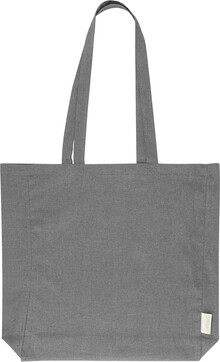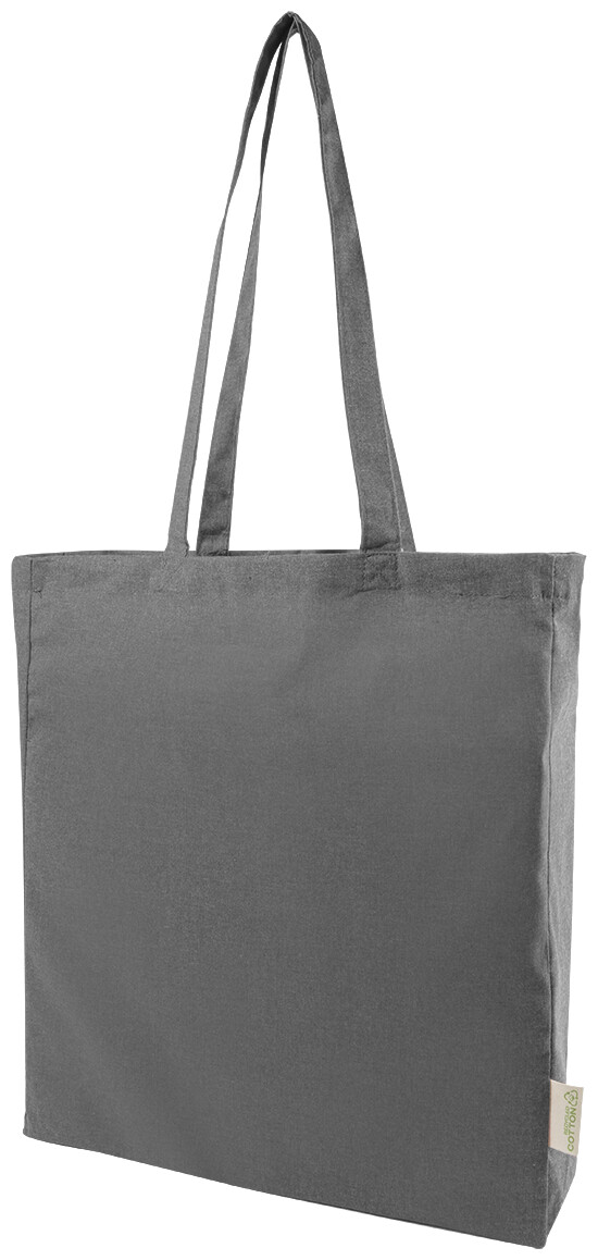 Nákupní taška s klínkem a dlouhými uchy ze 70 % recyklované bavlny a 30 % RPET polyesteru, 140 g/m2. S výraznou etiketou o recyklované bavlně.