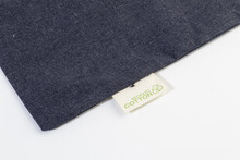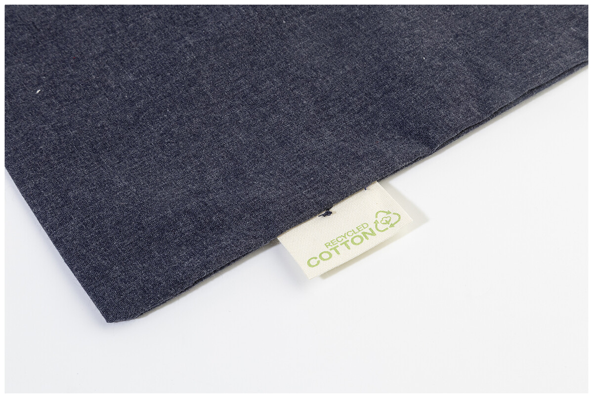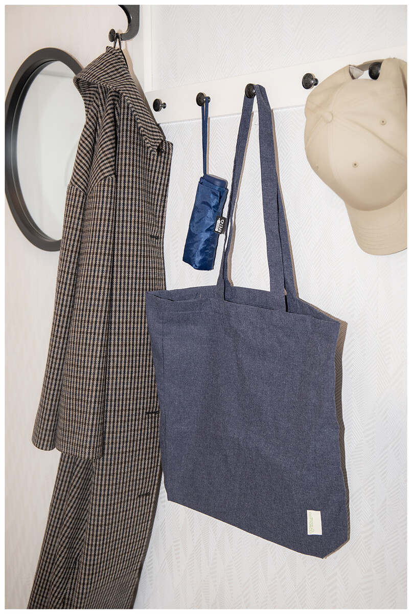 Nákupní taška s dlouhými uchy ze 70 % recyklované bavlny a 30 % RPET polyesteru, 140 g/m2. S výraznou etiketou o recyklované bavlně.