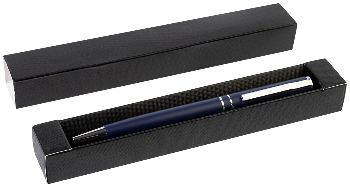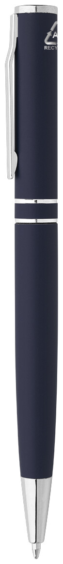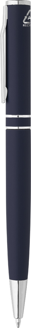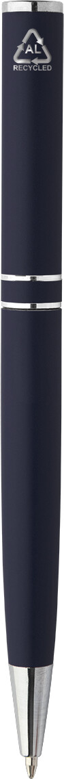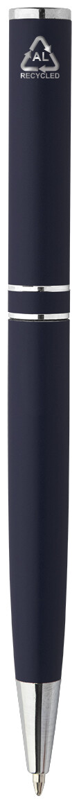 Kuličkové pero z recyklovaného hliníku s chromovanými částmi a kroužky. V černé dárkové krabičce. S modrou náplní.