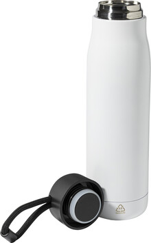 Dvoustěnná, vakuově izolovaná láhev z recyklované nerezové oceli s PP víčkem a integrovaným poutkem na nošení se šňůrkou. 500 ml.