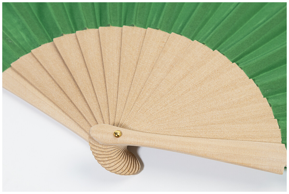 Vějíř z RPET polyesteru s dřevěnými žebry.