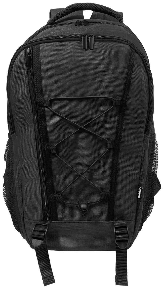 Outdoorový batoh z RPET s přihrádkami na zip a přední kapsou, polstrovanou přihrádkou na notebook (15"), síťovanými bočními kapsami a elastickými šňůrkami vpředu. S polstrovanými zády a ramenními popruhy. Polyester 600D RPET s výrazným štítkem RPET.