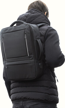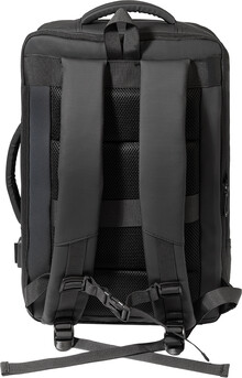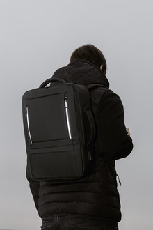 Voděodolný batoh a taška na dokumenty z RPET s možností prodloužení a hlavní přihrádkou na zip, předními kapsami s reflexními zipy, polstrovanou přihrádkou na notebook (15") a tablet (12") a vestavěným USB portem pro power banky. S popruhem na kufry, polstrovanými zády a ramenními popruhy s hrudním popruhem. Polyester 600D RPET s PU zátěrem a výrazným štítkem RPET.