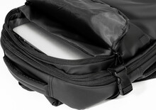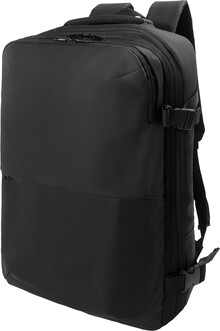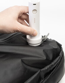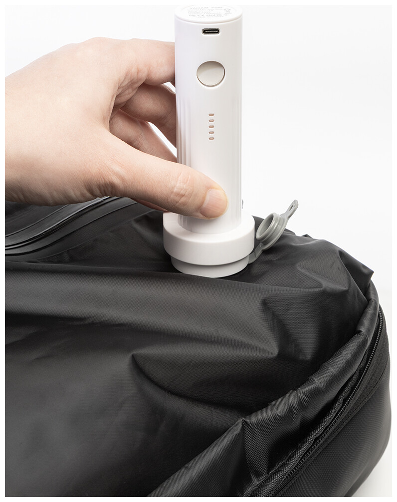 Voděodolný, rozšiřitelný kompresní batoh s přihrádkami na zip, vestavěnou vakuovou kompresní přihrádkou, polstrovanou přihrádkou na notebook (15") a přední kapsou na zip. S bočními přezkami, popruhem na kolečkách, polstrovanými zády a ramenními popruhy. Polyester 600D potažený PU. Včetně vakuové pumpy s USB dobíjecí baterií (1500 mAh).