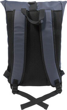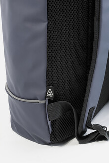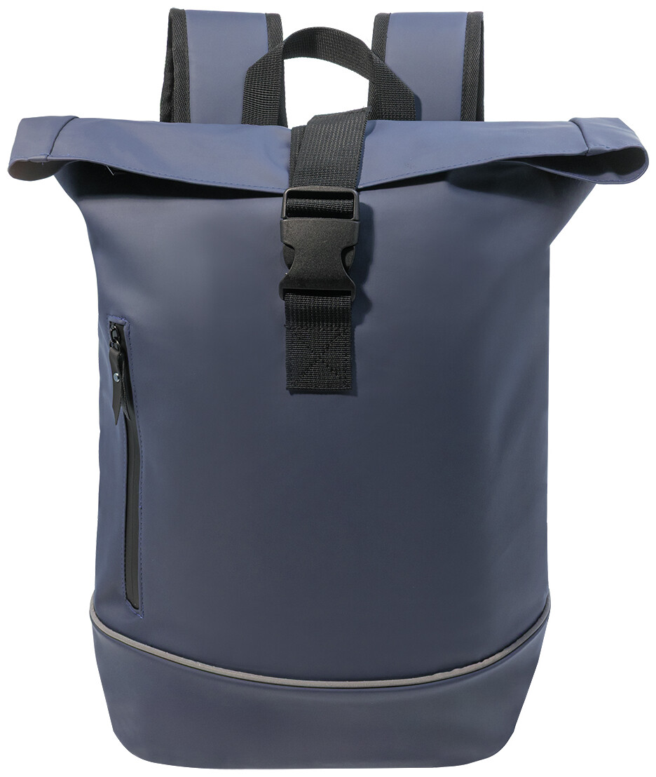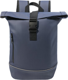 Voděodolný batoh s rolovacím vrškem z měkké recyklované PU kůže s hlavní přihrádkou na zip a zapínáním na přezku, přední kapsou s voděodolným zipem, polstrovanou přihrádkou na notebook (15") a reflexním proužkem. S polstrovanými zády a ramenními popruhy. S výraznou nálepkou z recyklované PU kůže.