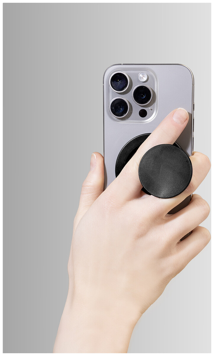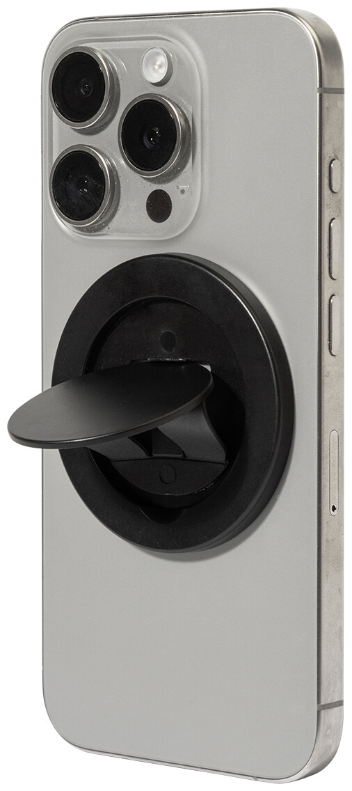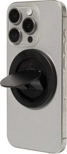 Magnetický držák na mobil z recyklovaného ABS. Včetně samolepicího kovového kroužku pro telefony bez magnetického povrchu.