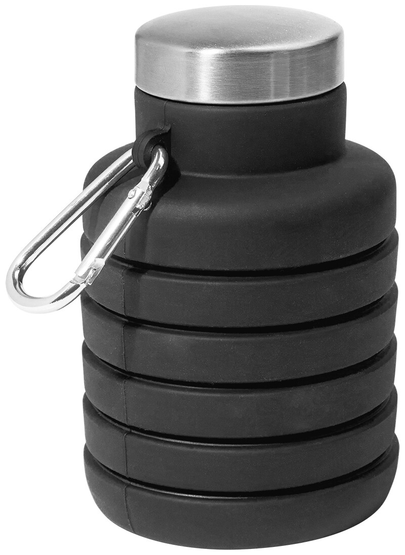 Skládací silikonová láhev s víčkem z nerezové oceli a hliníkovou karabinou. 500 ml