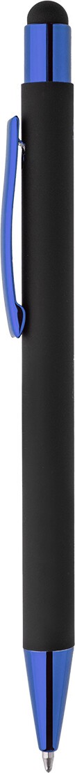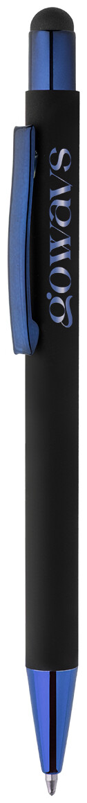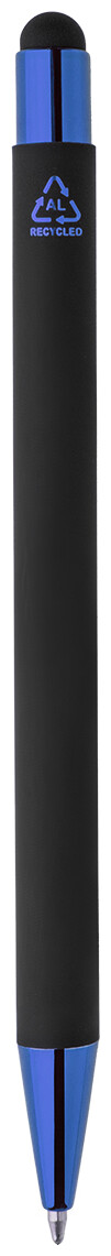 Kuličkové pero z recyklovaného hliníku na dotykovou obrazovku, s černým pogumovaným tělem a barevnými lesklými kovovými částmi. Se speciálním povrchem pro zrcadlové gravírování, které ladí s kovovými částmi. S modrou náplní.