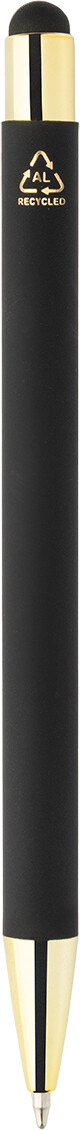 Kuličkové pero z recyklovaného hliníku na dotykovou obrazovku, s černým pogumovaným tělem a barevnými lesklými kovovými částmi. Se speciálním povrchem pro zrcadlové gravírování, které ladí s kovovými částmi. S modrou náplní.
