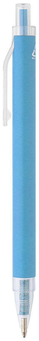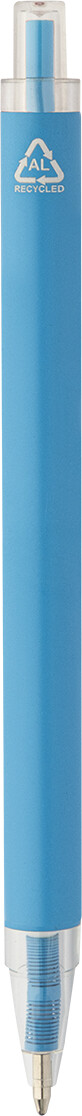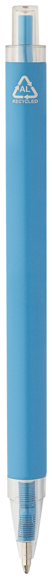 Kuličkové pero z recyklovaného hliníku s matným tělem a průhlednými RPET částmi. S modrou náplní.