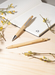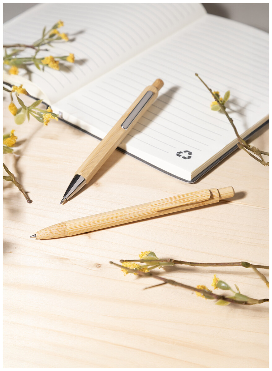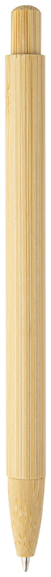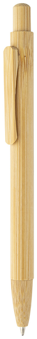 Kuličkové pero s bambusovým tělem, klipem, tlačítkem a špičkou. S modrou náplní.