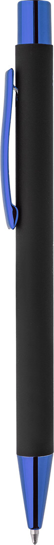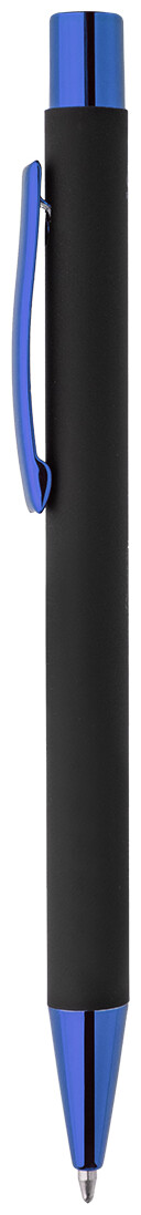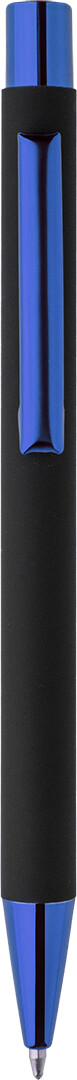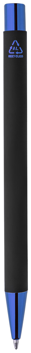 Kuličkové pero z recyklovaného hliníku s černým pogumovaným tělem a barevnými lesklými kovovými částmi. Se speciálním povrchem pro zrcadlové gravírování, které ladí s kovovými částmi. S modrou náplní.