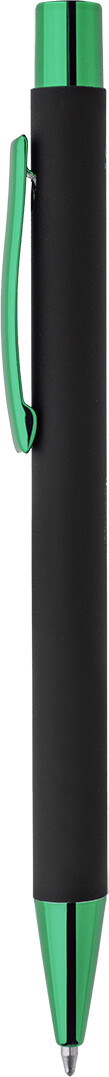 Kuličkové pero z recyklovaného hliníku s černým pogumovaným tělem a barevnými lesklými kovovými částmi. Se speciálním povrchem pro zrcadlové gravírování, které ladí s kovovými částmi. S modrou náplní.