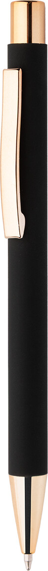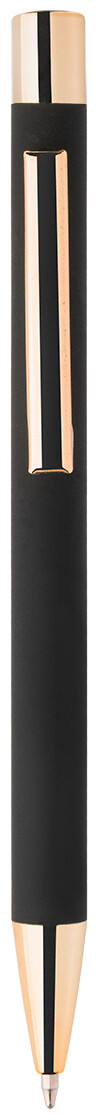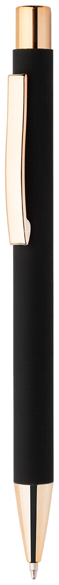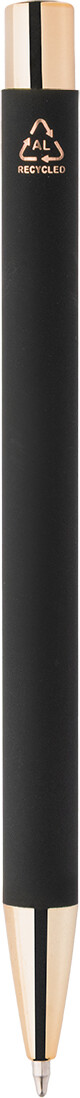 Kuličkové pero z recyklovaného hliníku s černým pogumovaným tělem a barevnými lesklými kovovými částmi. Se speciálním povrchem pro zrcadlové gravírování, které ladí s kovovými částmi. S modrou náplní.