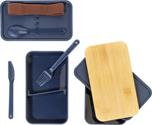 Box na jídlo z PP plastu se sadou příborů (vidlička, lžíce a nůž), bambusovým víkem a elastickým popruhem. Se 2 přihrádkami o objemu 700 ml.