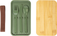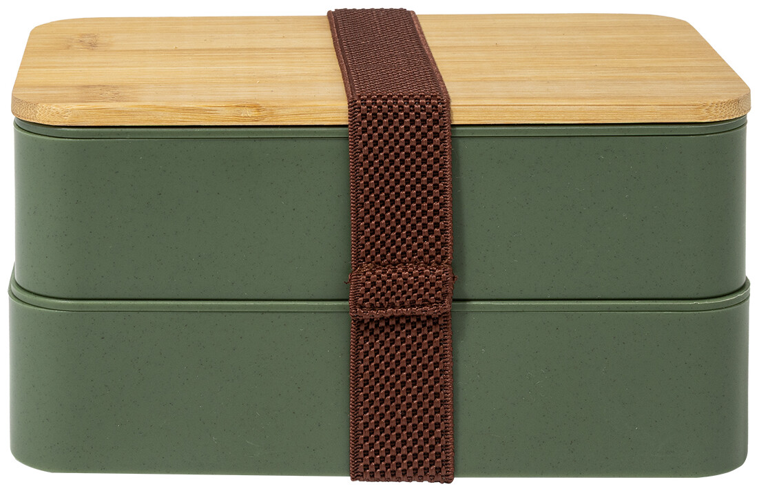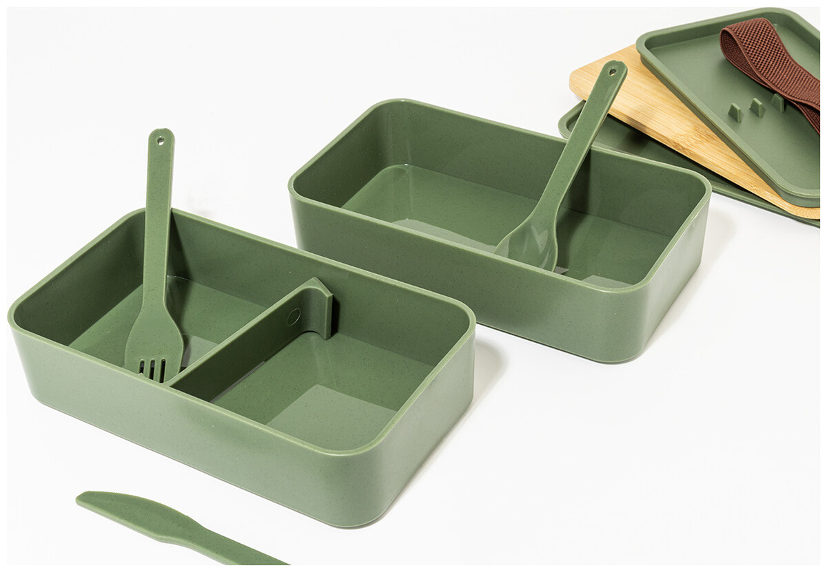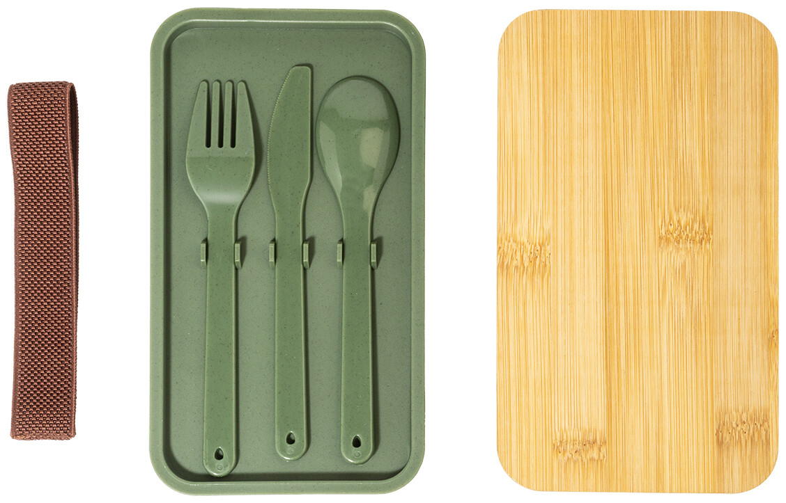 Box na jídlo z PP plastu se sadou příborů (vidlička, lžíce a nůž), bambusovým víkem a elastickým popruhem. Se 2 přihrádkami o objemu 700 ml.