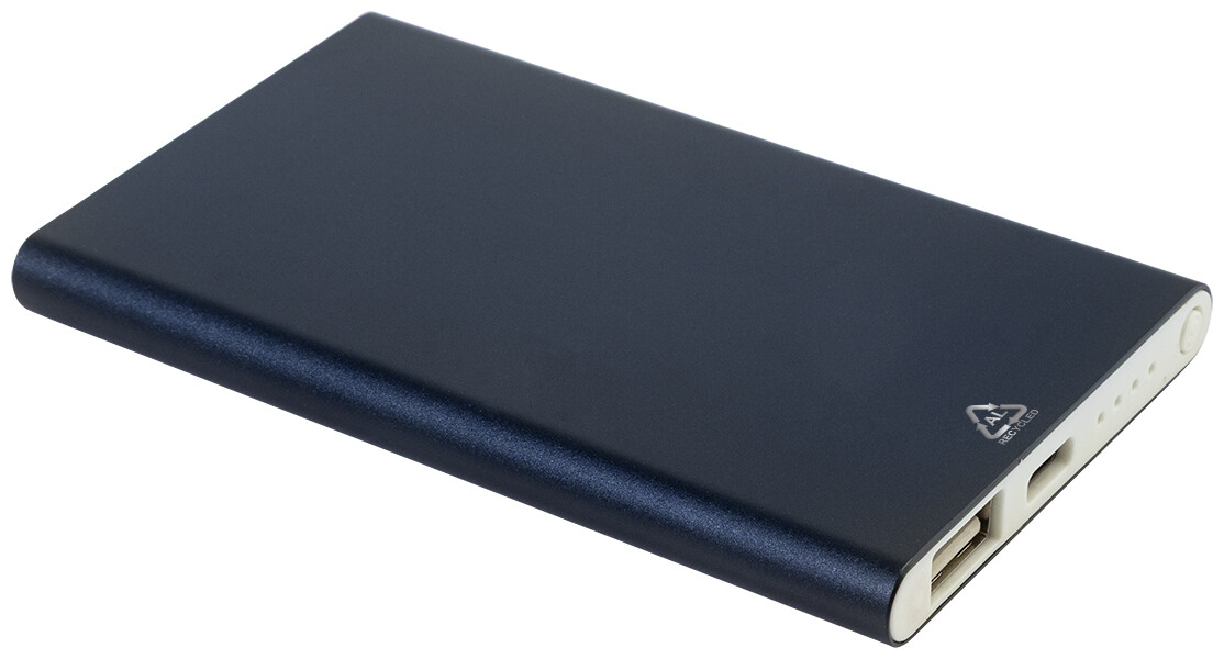 USB power banka v pouzdře z recyklovaného hliníku s 4000 mAh baterií. S 1 portem USB a 1 portem USB-C pro nabíječku. Vstupní port USB-C. Včetně USB nabíjecího kabelu.
