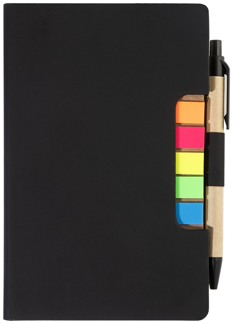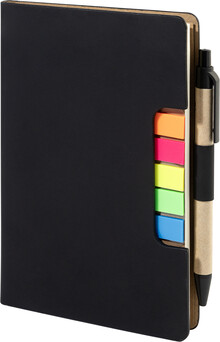 Blok s recyklovanou PU kůží, 70 linkovanými listy z recyklovaného papíru a 125 značkovači stránek (v 5 různých barvách). Včetně recyklovaného papíru a kuličkového pera z recyklovaného PP s modrou náplní.