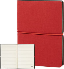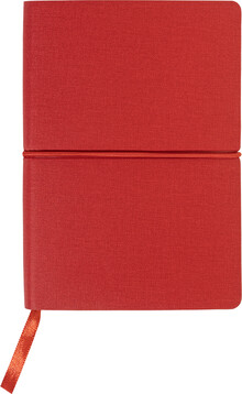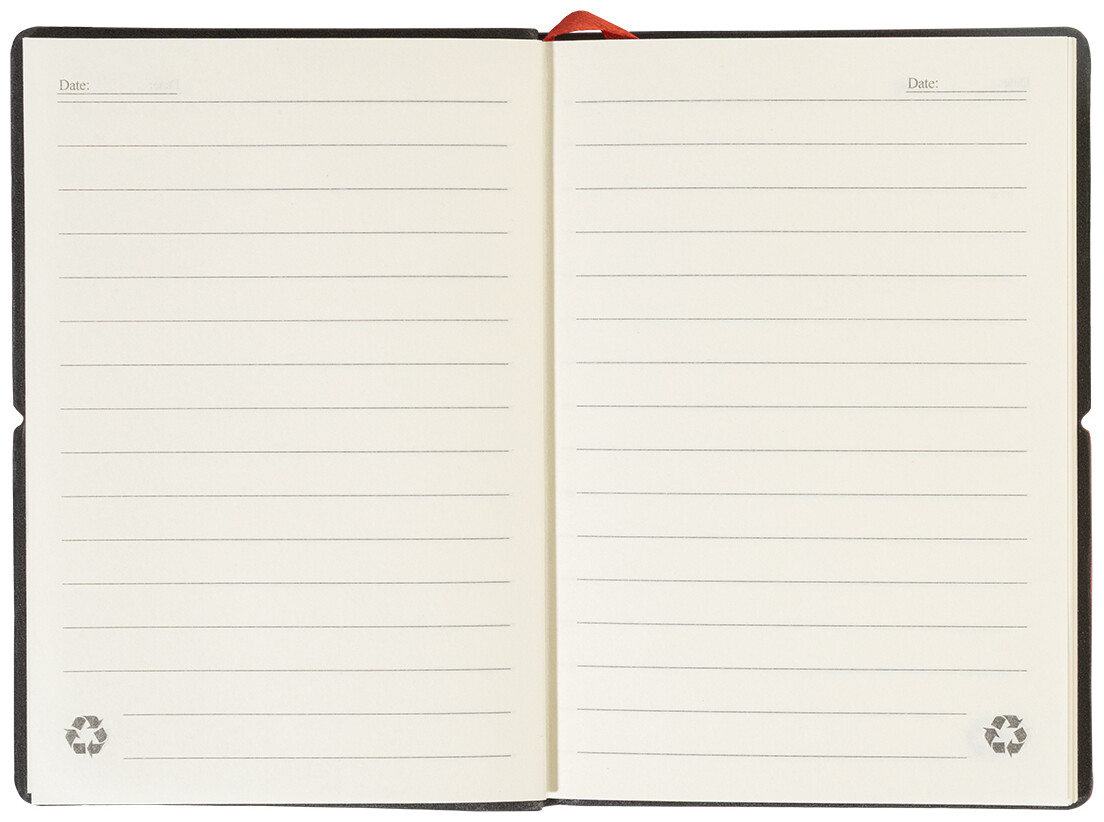 Blok A6 s recyklovanou PU kůží, 70 linkovanými listy z recyklovaného papíru, 25 samolepicími papírky a 125 značkovači stránek (v 5 různých barvách). Se záložkou a horizontálním gumovým páskem.