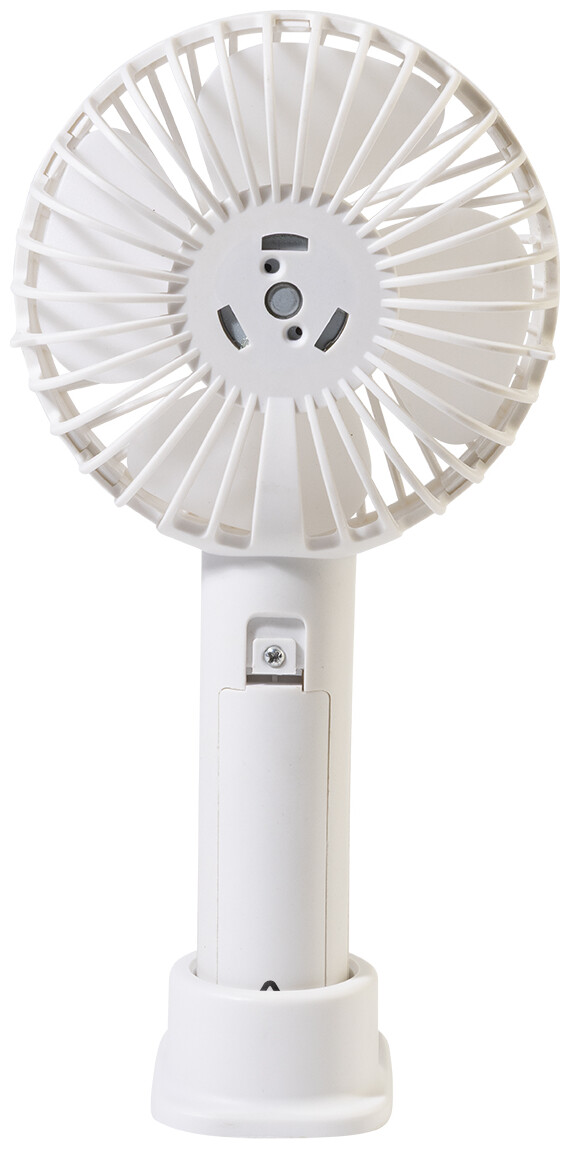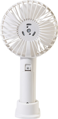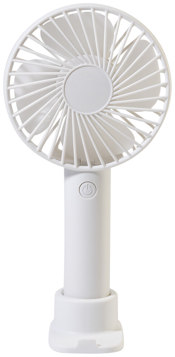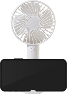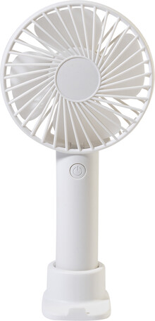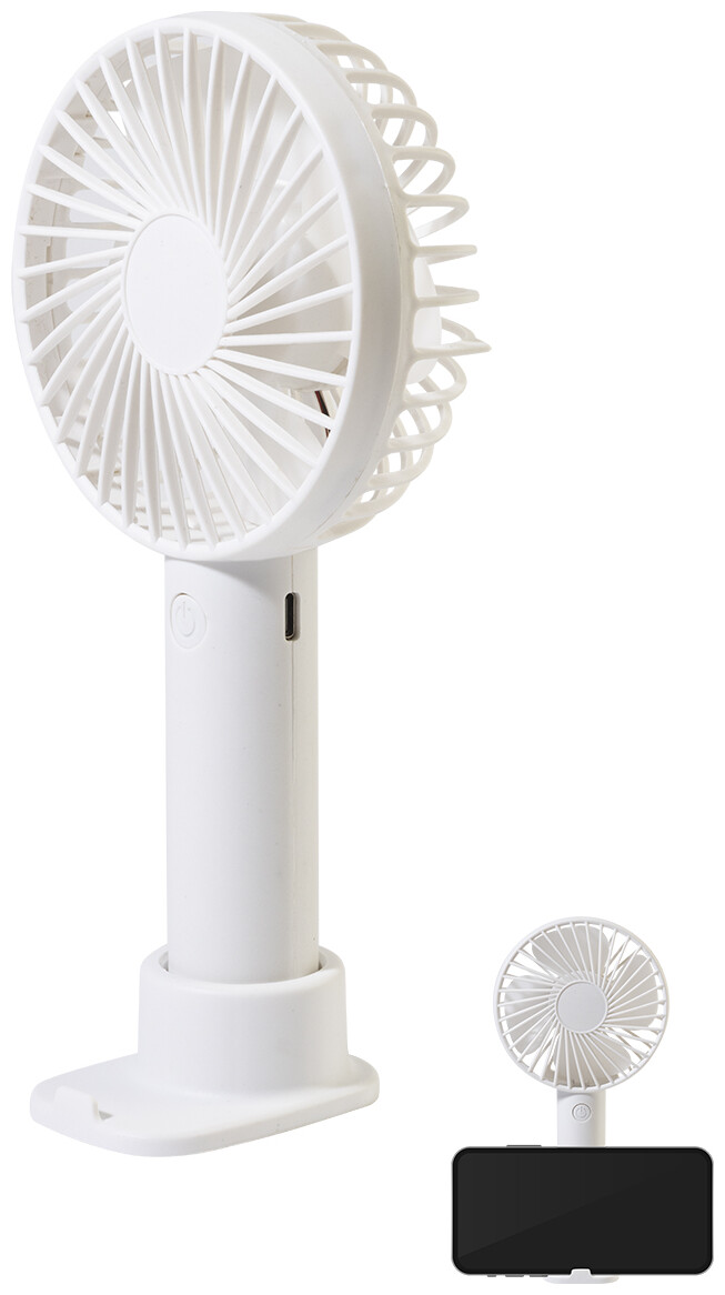 Elektrický ruční větráček z recyklovaného PP s držákem na mobilní telefon, stolním stojanem a vestavěnou dobíjecí baterií s USB portem (800 mAh). Se 3 rychlostmi. Včetně nabíjecího kabelu s USB portem.