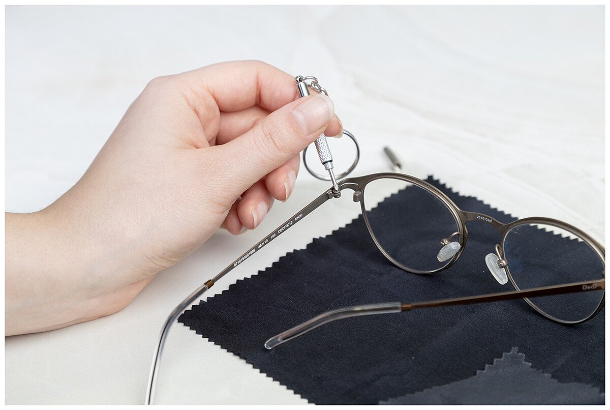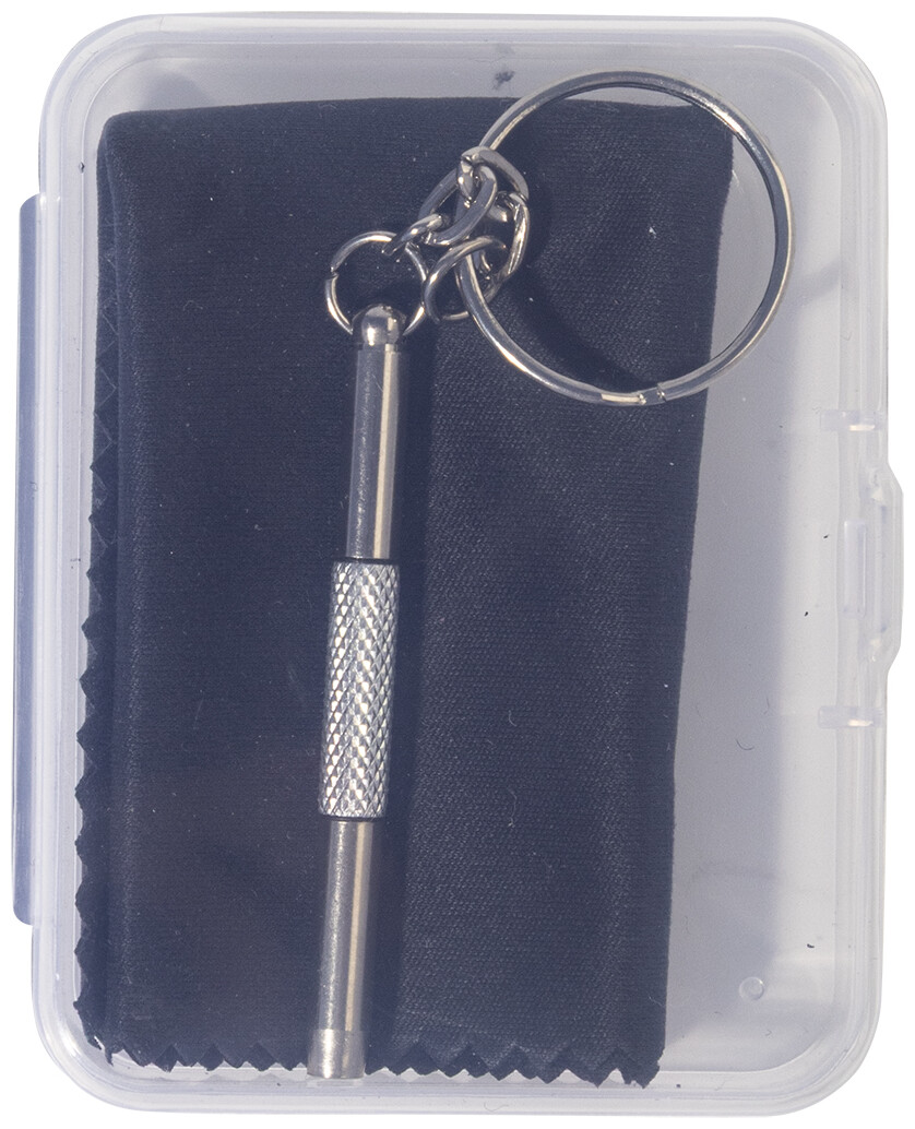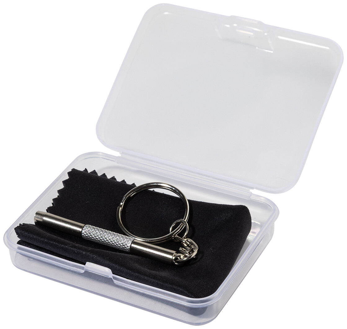 Kompaktní sada na opravu brýlí v průhledné PP krabičce. Včetně čisticího hadříku ze 100% RPET mikrovlákna (220 g/m2) a mini šroubováku s klíčenkou. Rozměr hadříku: 18×15 cm.
