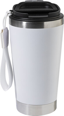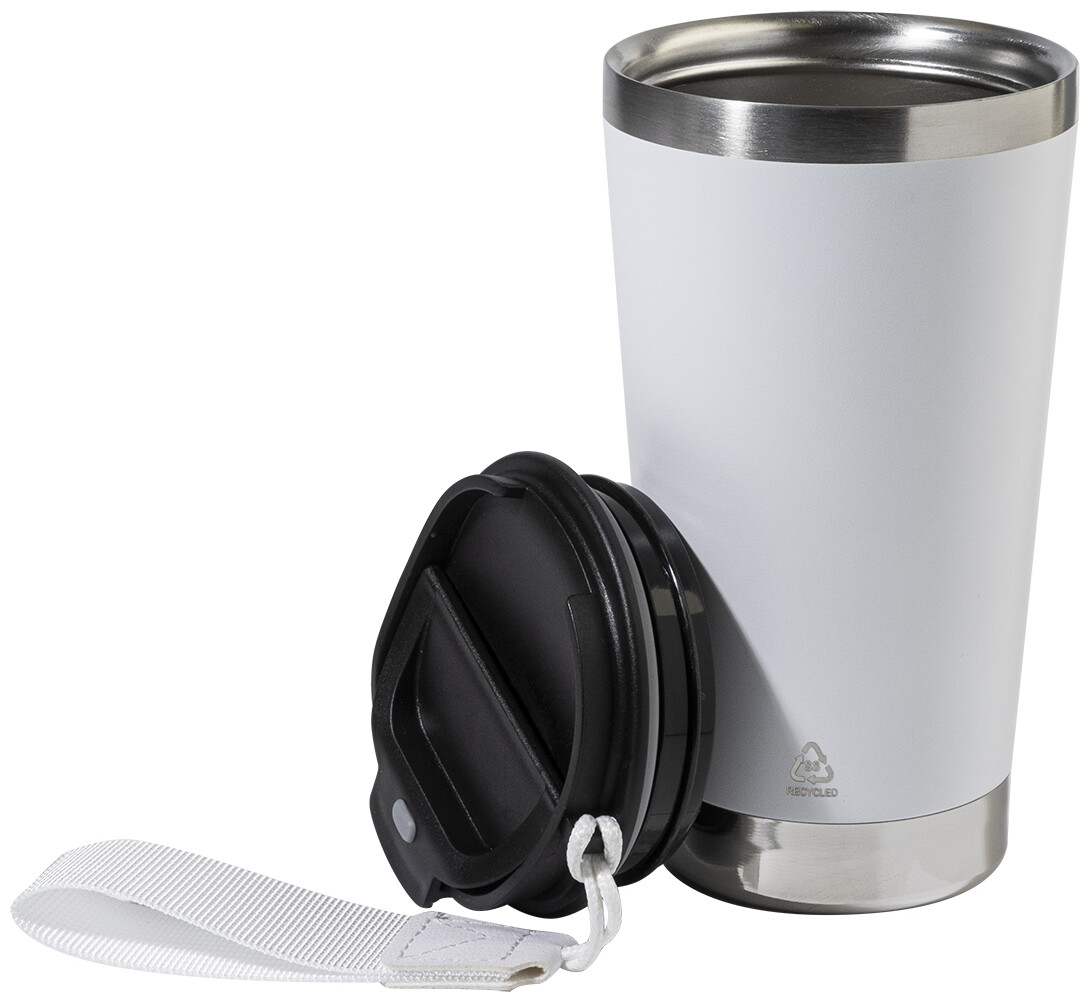 Dvoustěnný termo hrnek z recyklované nerezové oceli s víčkem na pití z PP a páskem na přenášení v odpovídající barvě. 430 ml.