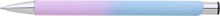Hliníková propiska se stříbrnými doplňky a měkkým pogumovaným soft povrchem ve růžovo–světle modrém přechodu. Náplň velkoobsahová, modře píšící.