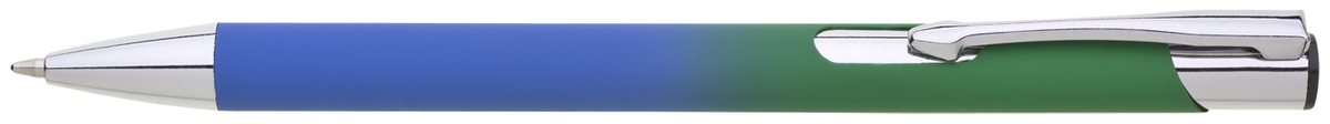 Hliníková propiska se stříbrnými doplňky a měkkým pogumovaným soft povrchem v modro-zeleném přechodu. Náplň velkoobsahová, modře píšící.