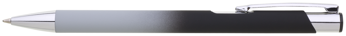 Hliníková propiska se stříbrnými doplňky a měkkým pogumovaným soft povrchem v šedo-černém přechodu. Náplň velkoobsahová, modře píšící.