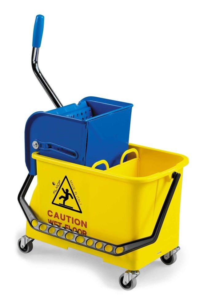 • Konstrukce: plastový vozík s přepážkou a stranovým ždímačem.