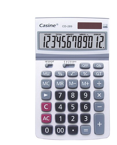 Stolní kalkulátor Casine CD-289, oceníte jak v kanceláři tak i ve škole. Disponuje velkým 12-místným displejem, solárním dobíjením a klávesnicí s velkými tlačítky v barevném kontrastním provedení pro pohodlné zadávání. Nechybí ani funkce jako automatické vypnutí, výpočet %, odmocnin, +/-, přirážky / slevy, celkový součet, tlačítko posunu doprava, paměť, výběr zaokrouhlení, výběr počtu desetinných míst.