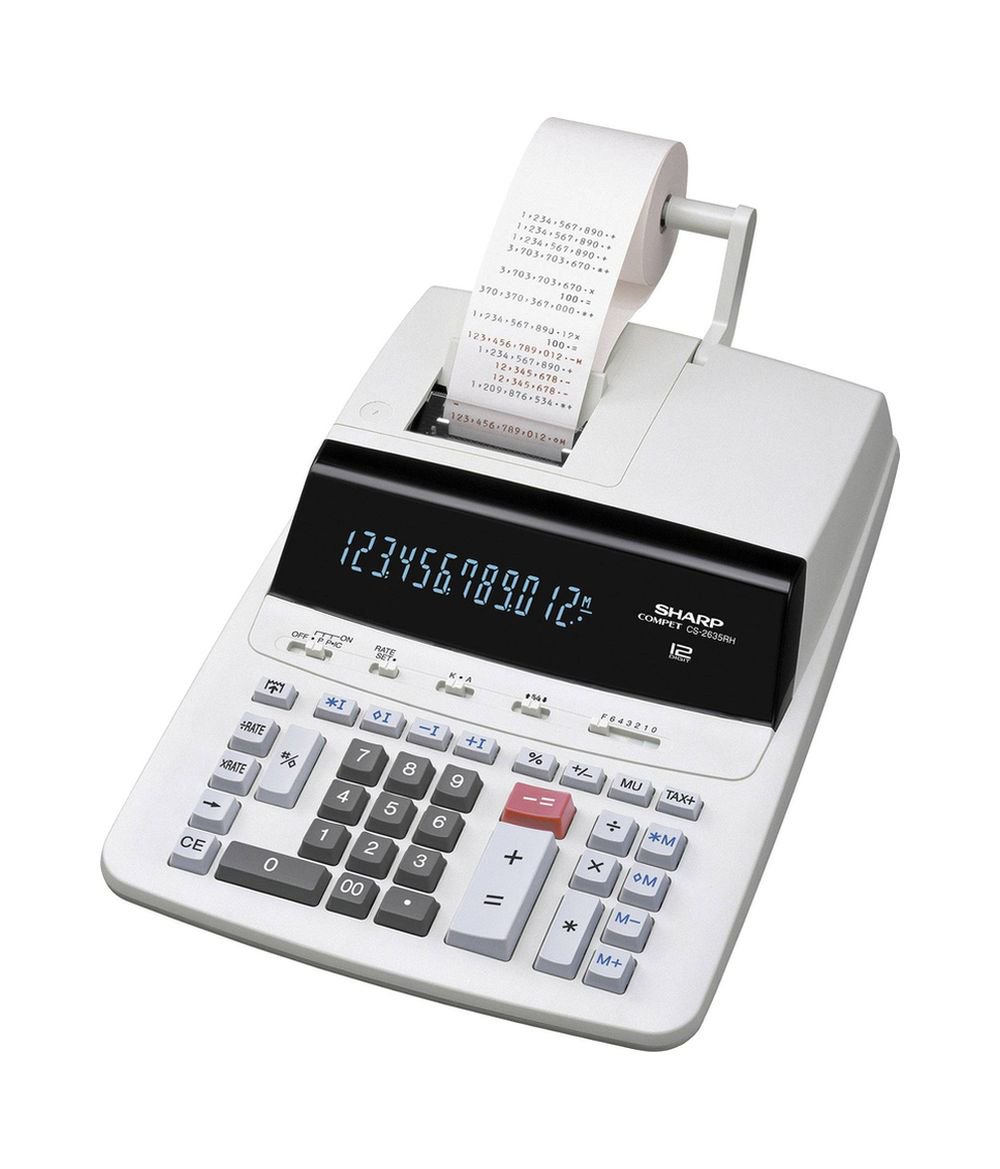 Kalkulátor Sharp CS-2635Rh je vhodným nástrojem na výpočet pro daňové účetní, provozní restaurací i pro inventury. Tento kalkulátor na rozdíl od ostatních Vám vše důležité nejen spočítá ale následně si výsledek můžete i vytisknout a tak si celý zápis a postup výpočtu ověřit. Větší plastové tělo v sobě ukrývá dvoubarevný tisk a návin na pásku vhodnou pro tisk, 1 řádkový 12-místný displej, tlačítko s dvojitou nulou, korekční tlačítko a zbylou klávesnici. Systém obsahuje velké množství funkcí jako jsou přepočet (CONV) a TAX (výpočet ceny vč. přirážky daně), %, ±, symbol operace, tlačítko MU, konstanta, tlačítko 00, zaokrouhlování, funkce TAB a další.