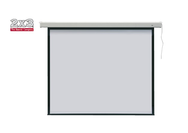 Nástěnné projekční plátno s elektrickým stahováním s dálkovým ovládáním, formát 4:3, matný bílý povrch a černá bordura zaručují kvalitní obraz, plátno lze připevnit i na strop.