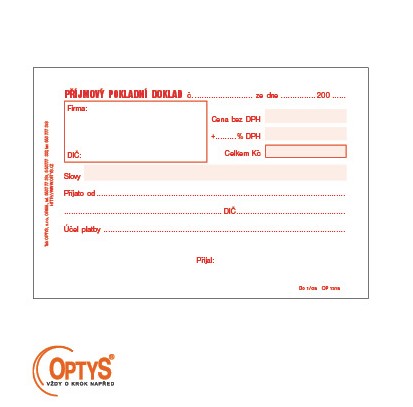 | 1709213 | PŘIJMOVÝ POKLADNÍ DOKLAD OPTYS obyč.50 listů | 21,12 Kč | 25,56 Kč | 1 ks | |||