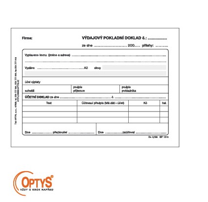 | 1709310 | VÝDAJOVÝ POKLADNÍ DOKLAD OPTYS samopropisovací pro podvojné účetnictví | 34,03 Kč | 41,18 Kč | 1 ks | |||
