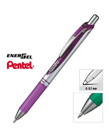 EnerGel s rychleschnoucí gelovou náplní. Stopa 0,7 mm, délka stopy 550 m. Elegantní moderní design. Kovový klip, mačkací mechanika. Pogumovaný grip pro pohodlné psaní. Barva doplňků odpovídá barvě náplně. Náhradní náplň LR7.